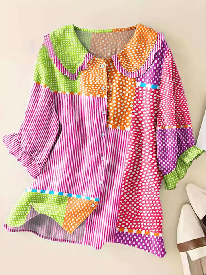 Women Vintage Abstract Geometric Art Print Loose Top Peter Pan Collar Half Sleeve Blouses