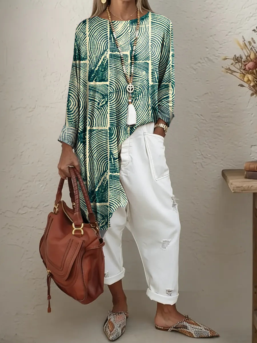 Ethnicity Geometry Dark Green Tree Rings Women's Print Irregular Hem Cotton Long-sleeve T-shirt