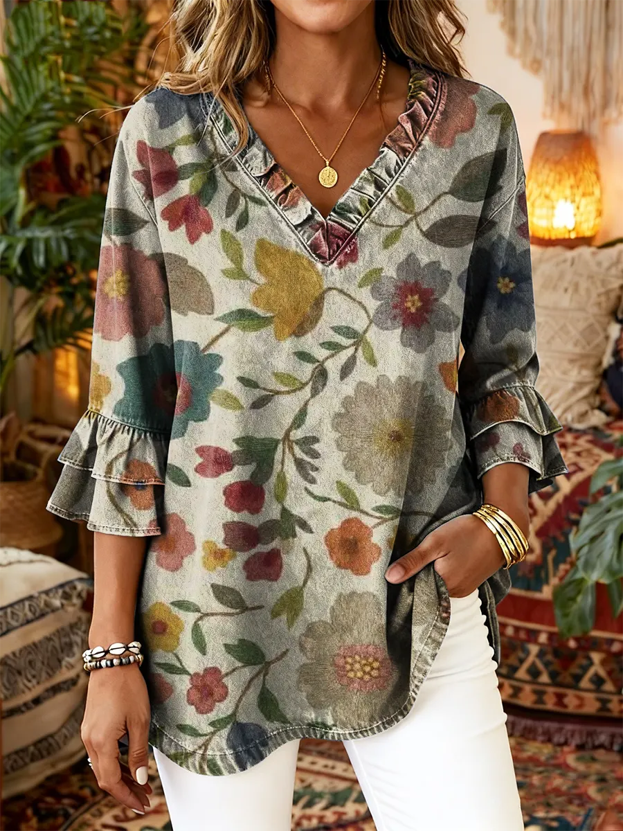 Women's Floral Art Print Ruffled V-Neck Top
