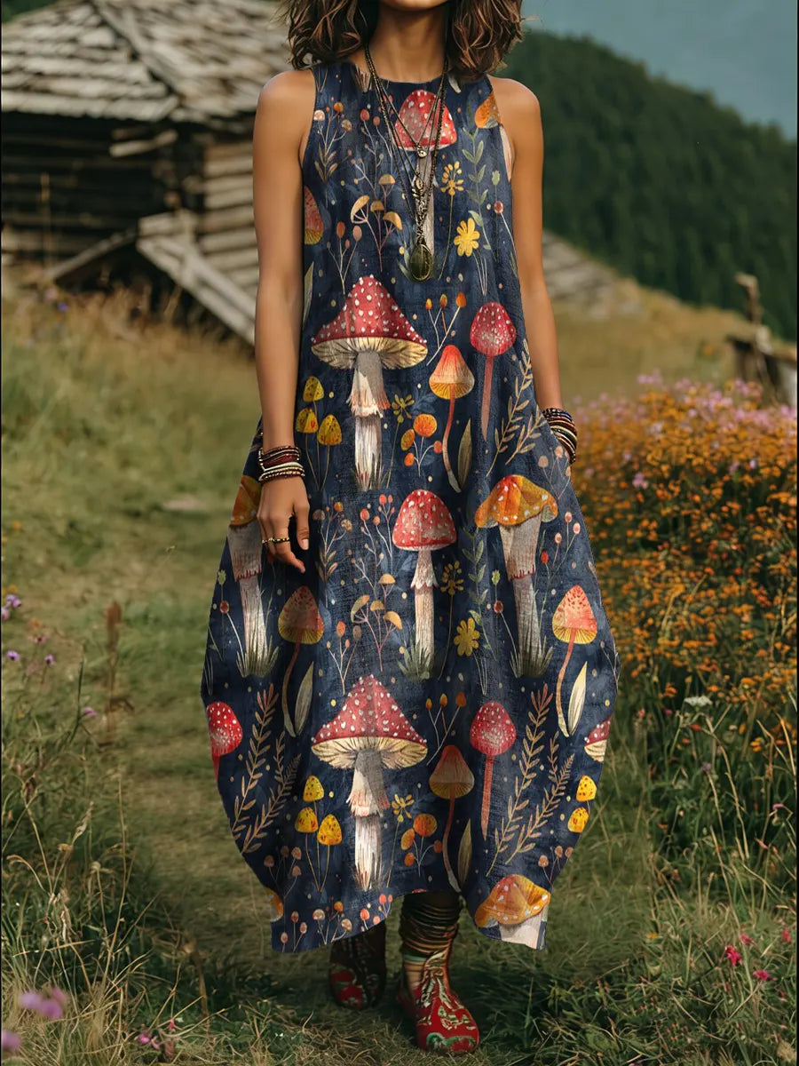 Women's Mushroom Garden Art Print Round Neck Sleeveless Cotton Pocket Dress