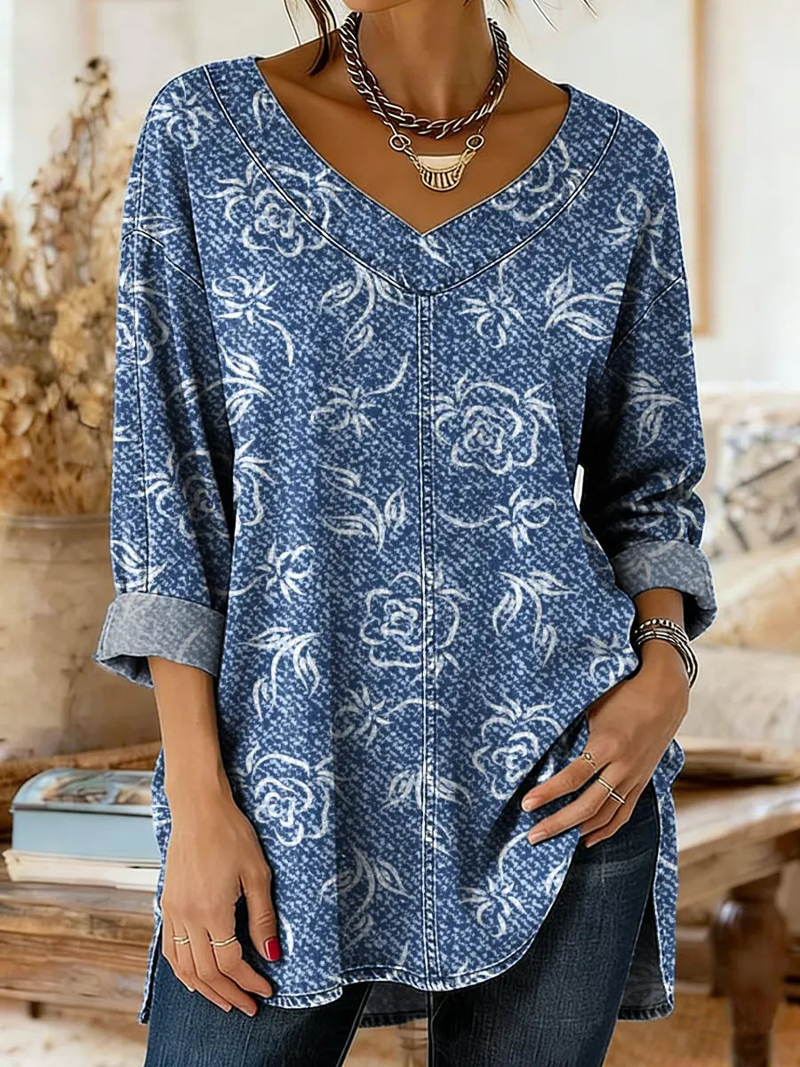 Women's Floral Art Print Casual Washed Denim Cotton Top