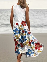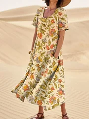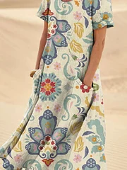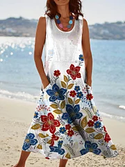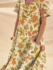 Women's Retro Floral Art Print Casual Linen Pocket Dress