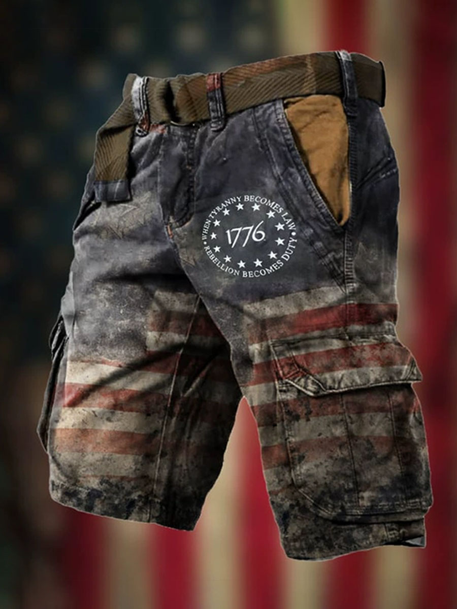 Men's Vintage Distressed 1776 American Flag Print Casual Loose Pocket Cargo Shorts