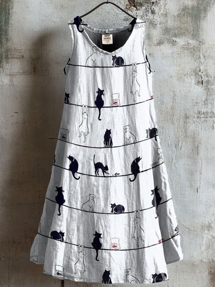 Women's Cute Cat Print V-neck Pocket Cotton Dress
