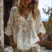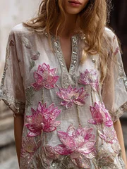 Bohemian Style Pink Three-dimensional Embroidery Gradient Multi-layer Lotus Flower Sequin Embellishment Light And Thin Vintage Short Sleeve V-neck Top
