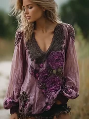 Vintage Purple Rose Design Summer V-neck Long-sleeved Linen Top