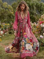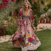 Women's Vintage Floral Print V-neck Long Sleeve Maxi Dress