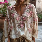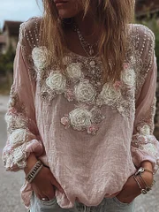 Women's Vintage Embroidered Flower Long-sleeved Casual Top