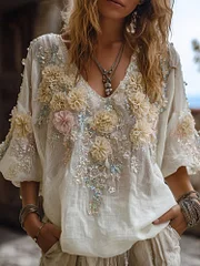 Bohemian Three-dimensional Pink Floral Sequin V-neck Long-sleeved Top