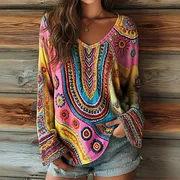 Women's Floral Art Print Casual V-neck Long Sleeve Top