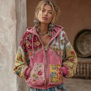 Women's Vintage Floral Embroidery Patchwork Art Cozy Zipper Hoodie