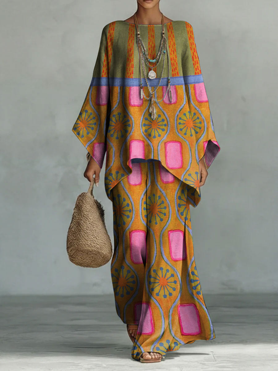 Women's Vintage Abstrct Casual Art Comfortable Loose Cotton Linen Wide-leg Pants Two-piece Set