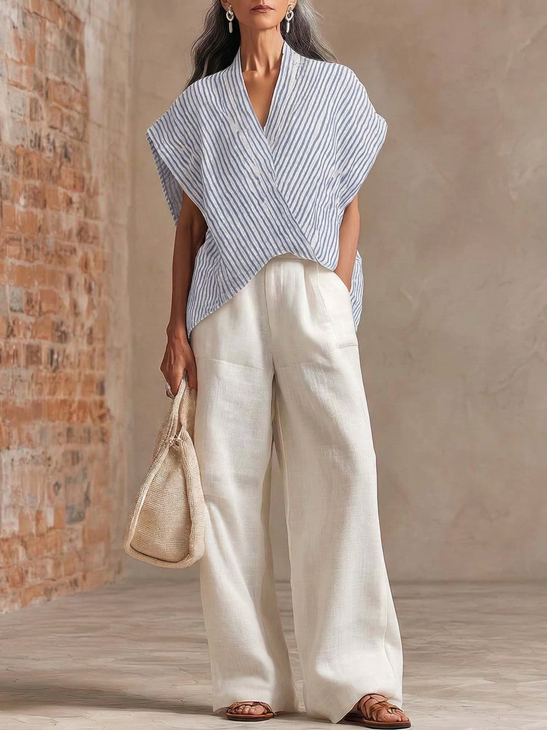 Artistic Cut Striped Top And Wide-leg Pants Linen Two-piece Set