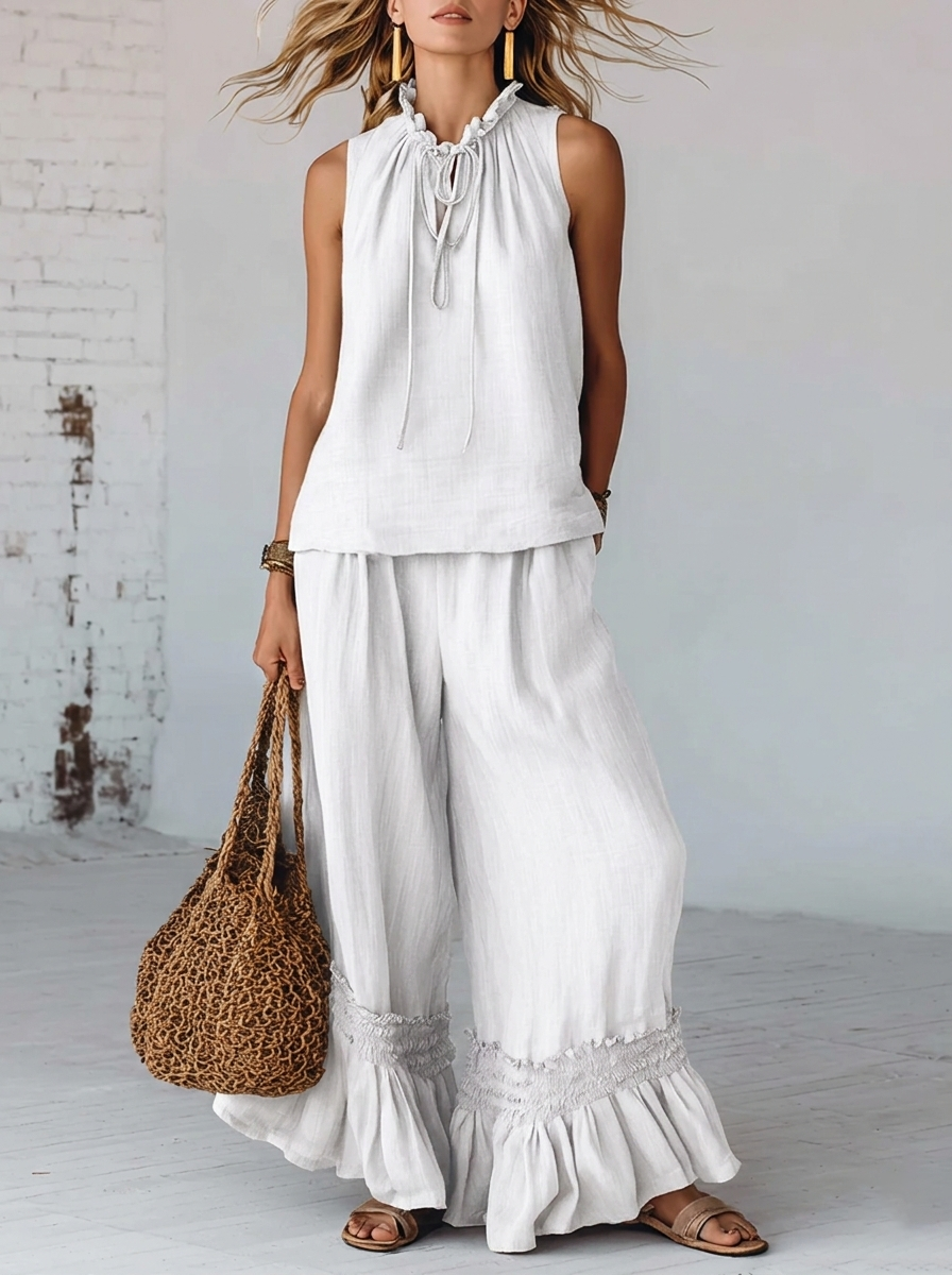 Bohemian Lace-up Blouse And Ruffled Wide-leg Pant Linen Set