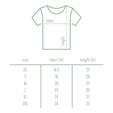 Our sizing chart measurements are based on a tee that has been laid flat and measured that way! We recommend comparing with a favorite tee from home. All of our tees are unisex sizing, and our customers generally find that they run true to size.