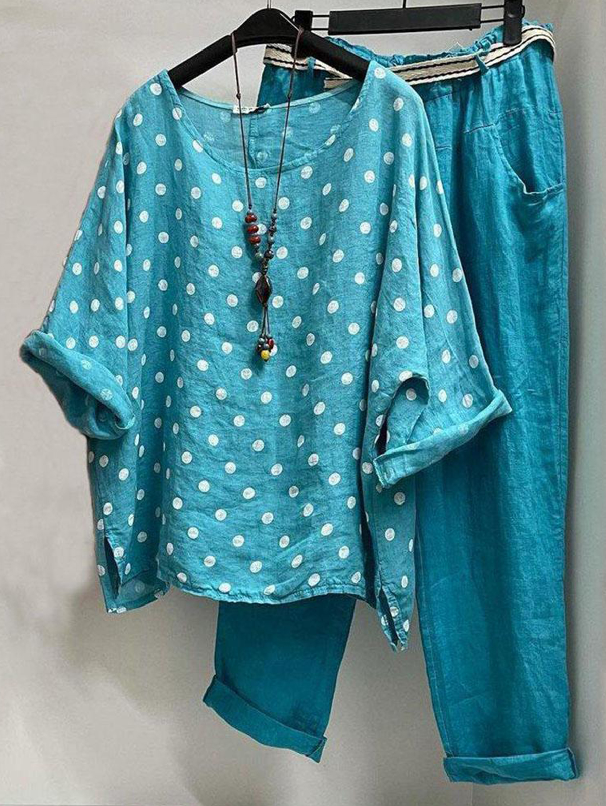 Casual Polka Dot Crew Neck Blouse & Pocket Pants 2Pcs Set