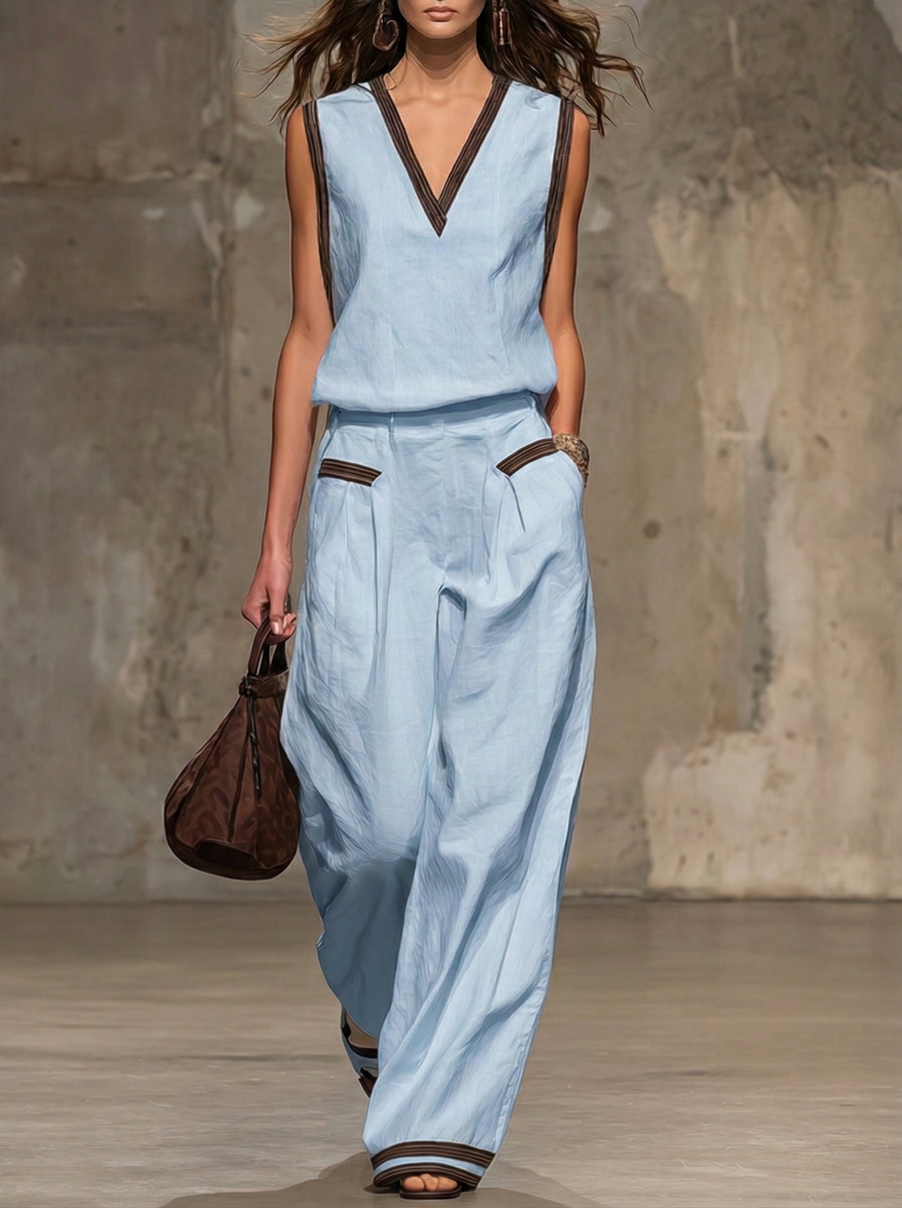 The casual retro brown-trimmed white cotton linen sleeveless top and pants set is a delightful blend of vintage-inspired charm and contemporary comfort. The white cotton-linen fabric offers breathability and a lightweight feel, making it ideal for warmer weather. The brown trim adds a touch of retro flair, creating a subtle contrast that enhances the overall design of the set. The sleeveless top and matching pants provide a cohesive and relaxed silhouette that works well for a variety of casual occasions.