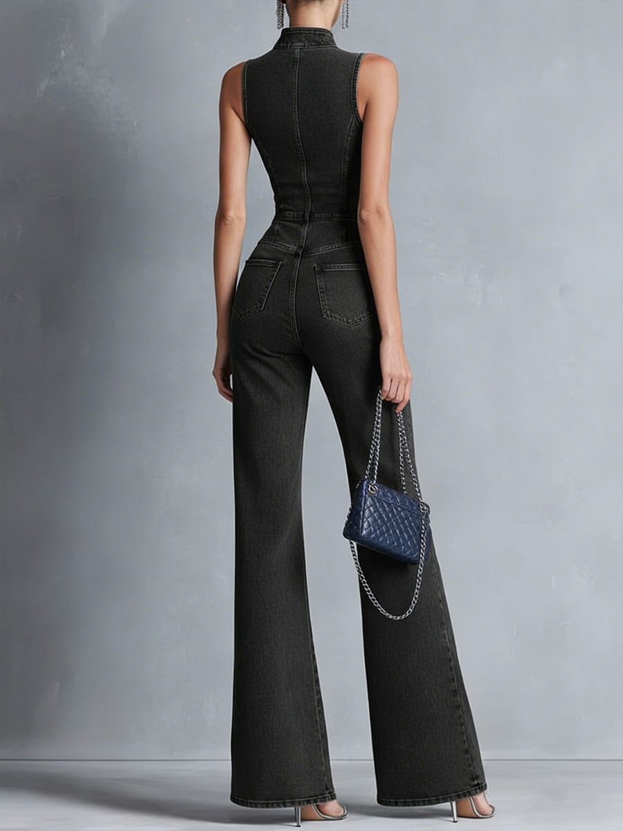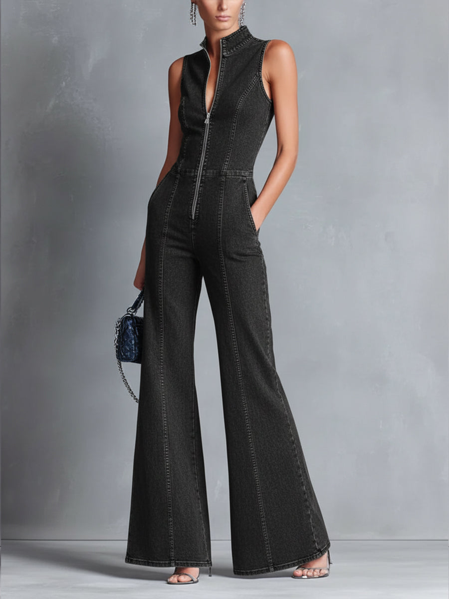 Casual Zipper Sleeveless Denim Flared Jumpsuit
