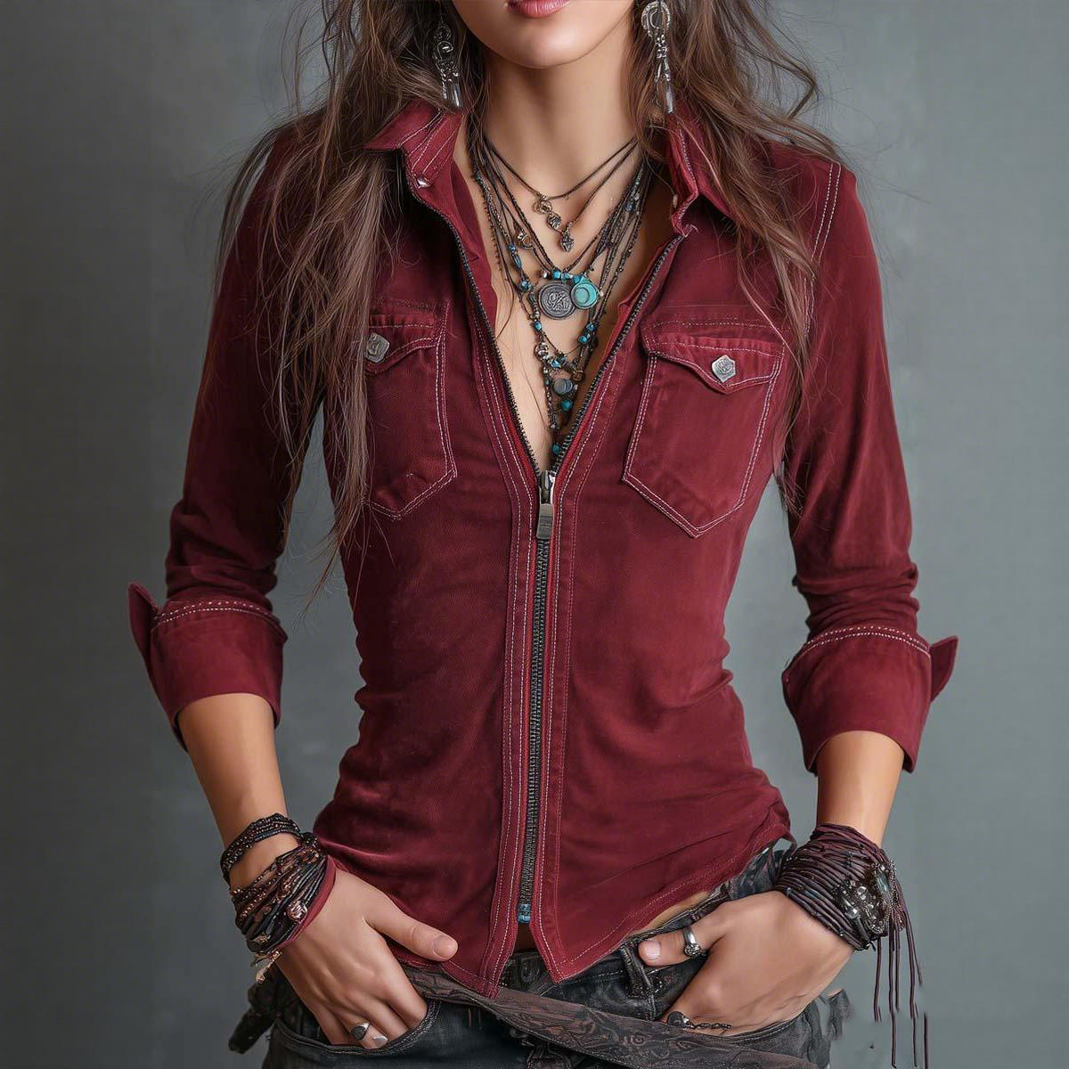 Cotton Denim Zip-Up Shirt For Women Red Long Sleeve Casual Boho Style Top With Pockets And Button Details