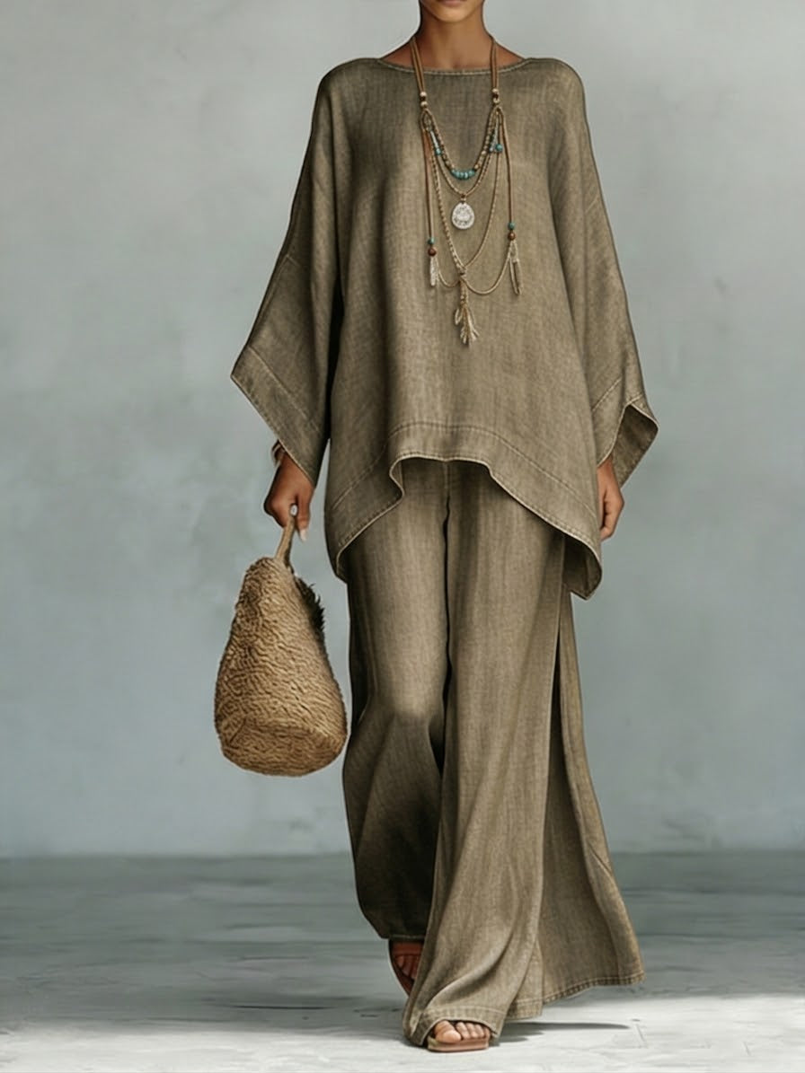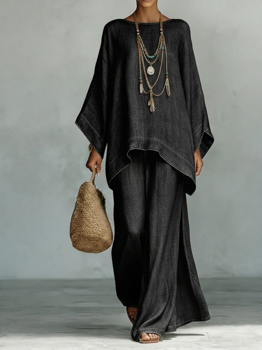 Cozy And Casual Tencel Denim Top And Wide-leg Pants Two-piece Set