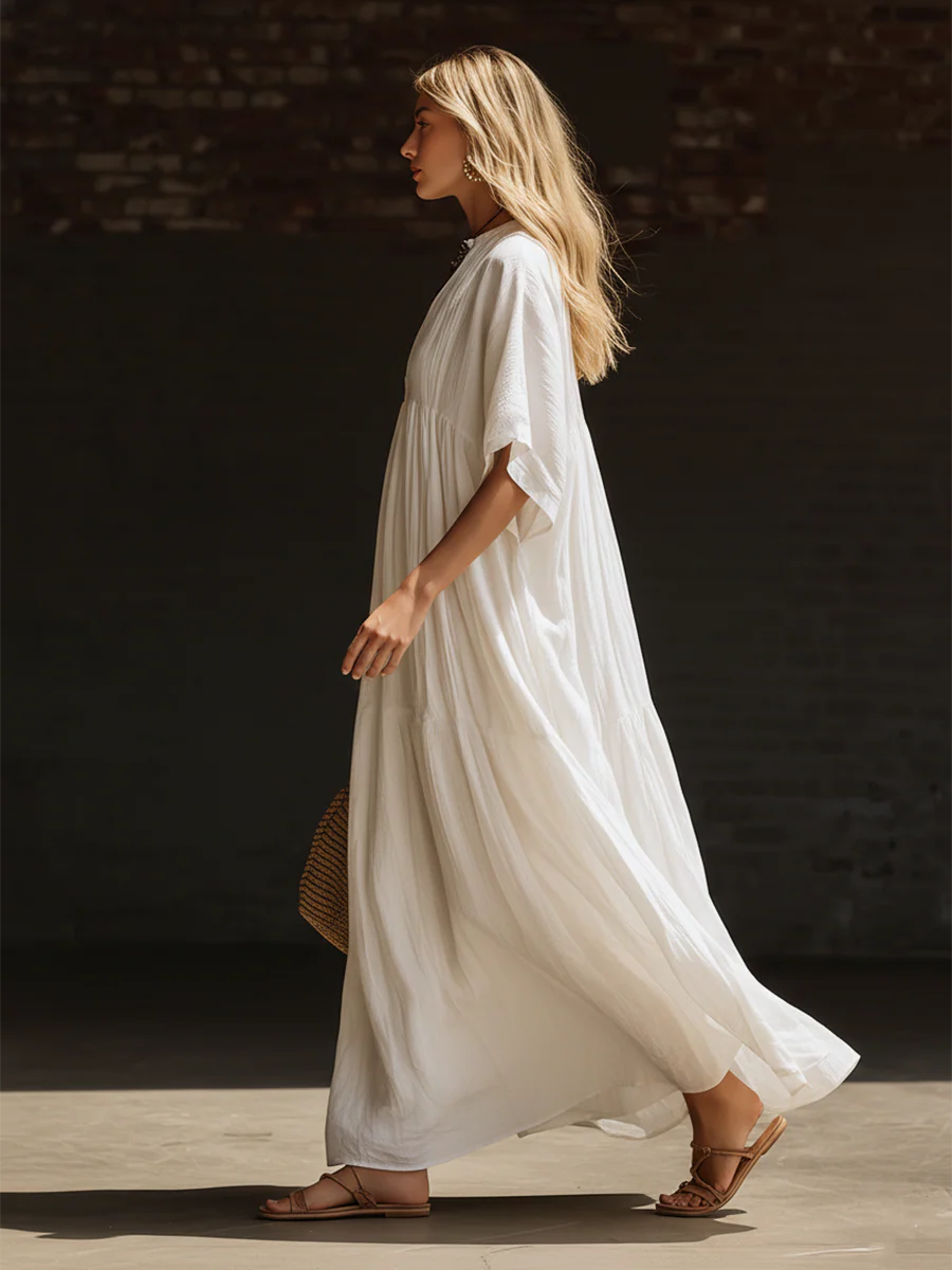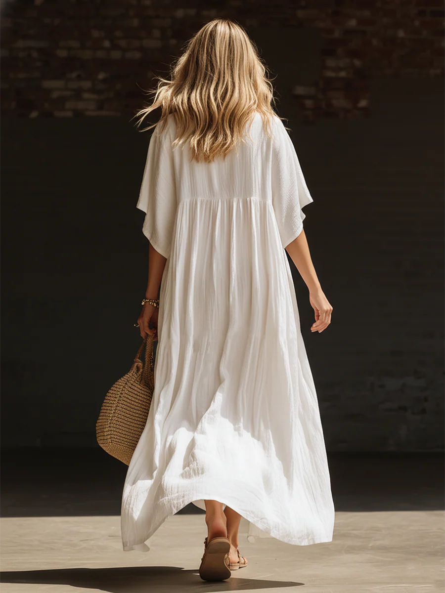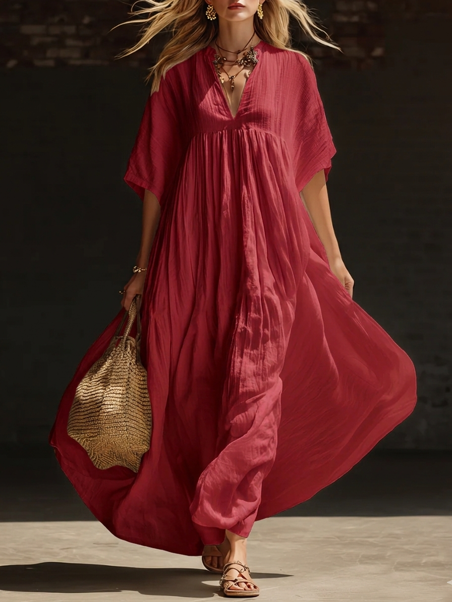 Cozy Vacation V-neck Loose Linen Cotton Maxi Dress