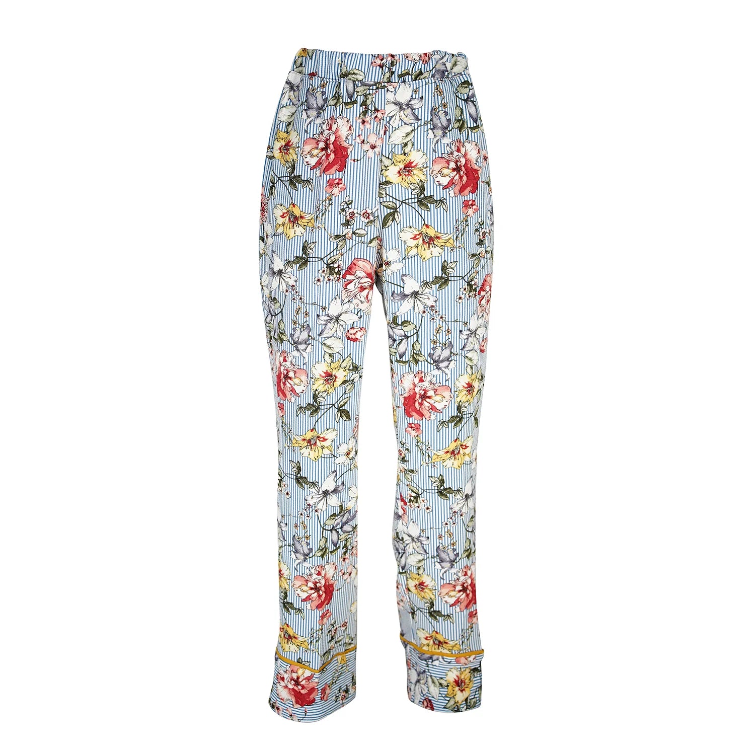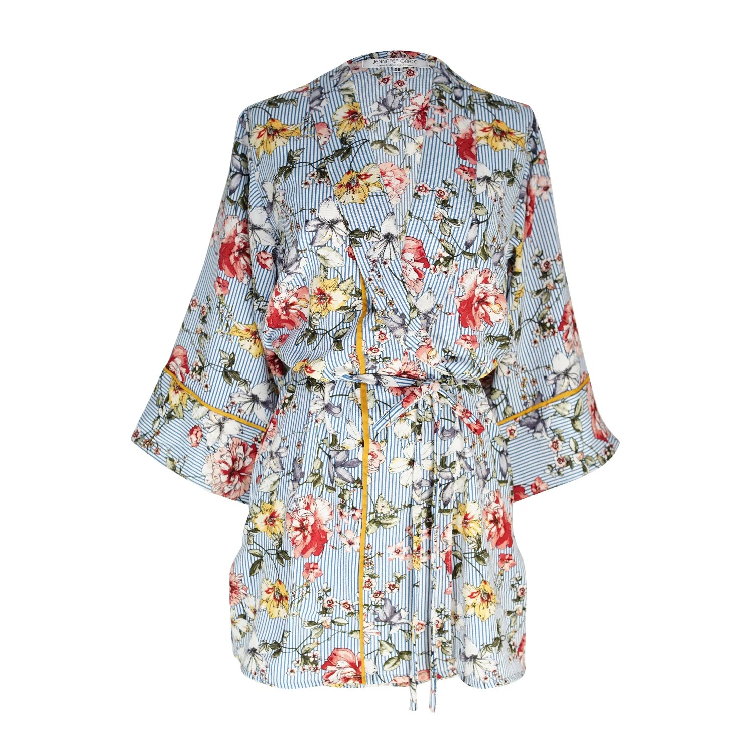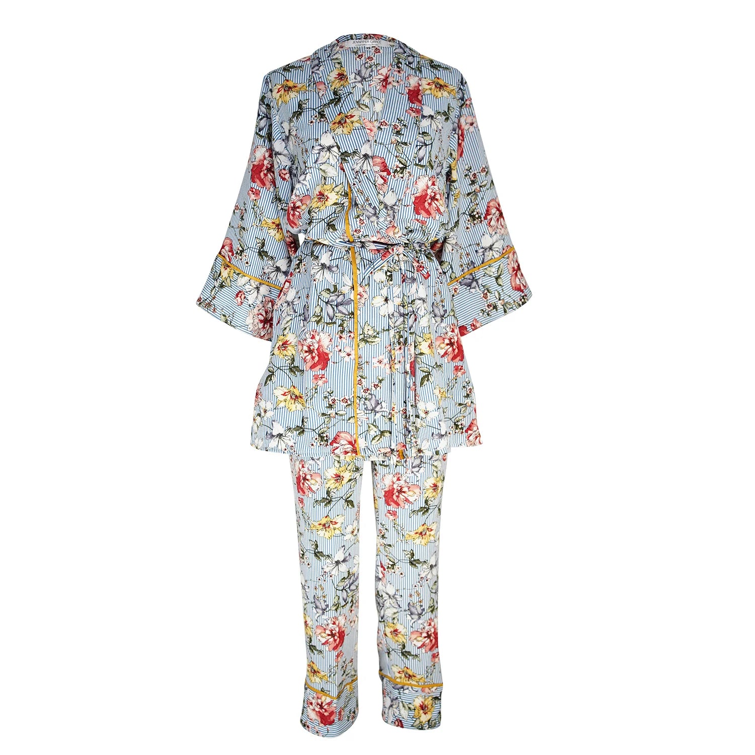 These classic floral striped paglamas are handmade with a bubble crepe georgette and matching orange piping.. The short wrap-style kimono (with pockets!) and side seam buttonholes make the perfect wrap top. The tapered pant features pockets, and a crisp business press.
