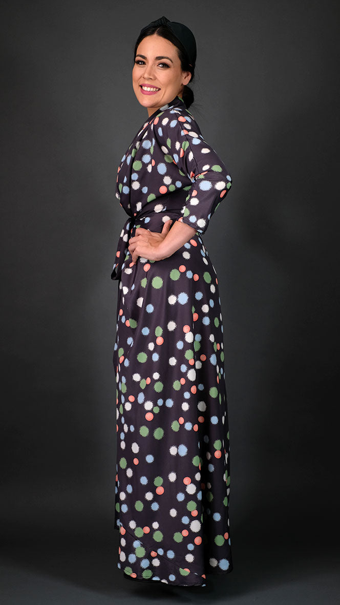 ¾ sleeves, with an adjustable wrap tie that creates a cinched waist effect and lengthening illusion for the perfect silhouette on any shape!