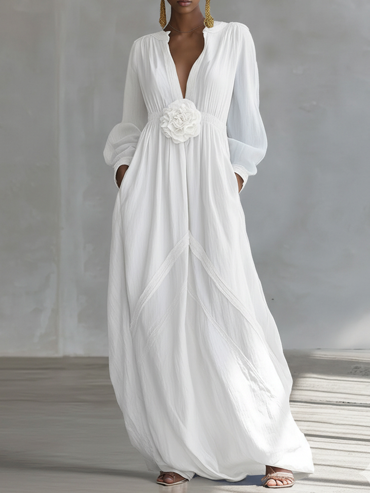 Elegant Three-dimensional Floral Cotton And Linen Maxi Dress