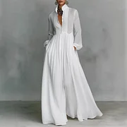 Elegant White Long Sleeve Maxi Dress With Button Front And Deep V-Neckline