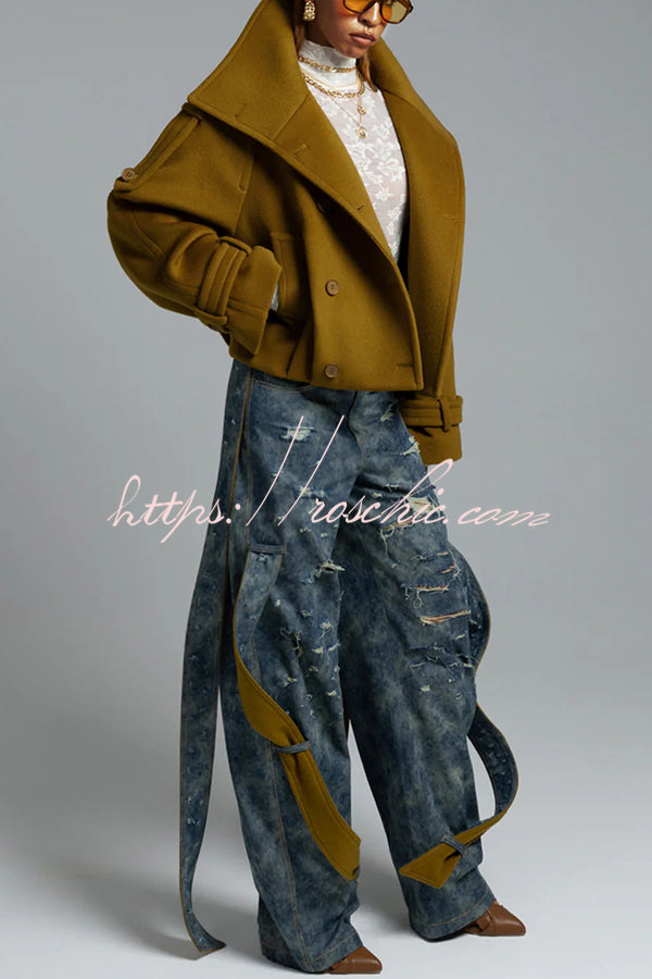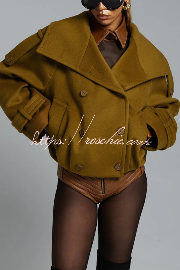 Ellie Epaulettes Stand Neck Double-Breasted Pocket Cropped Loose Woolen Coat