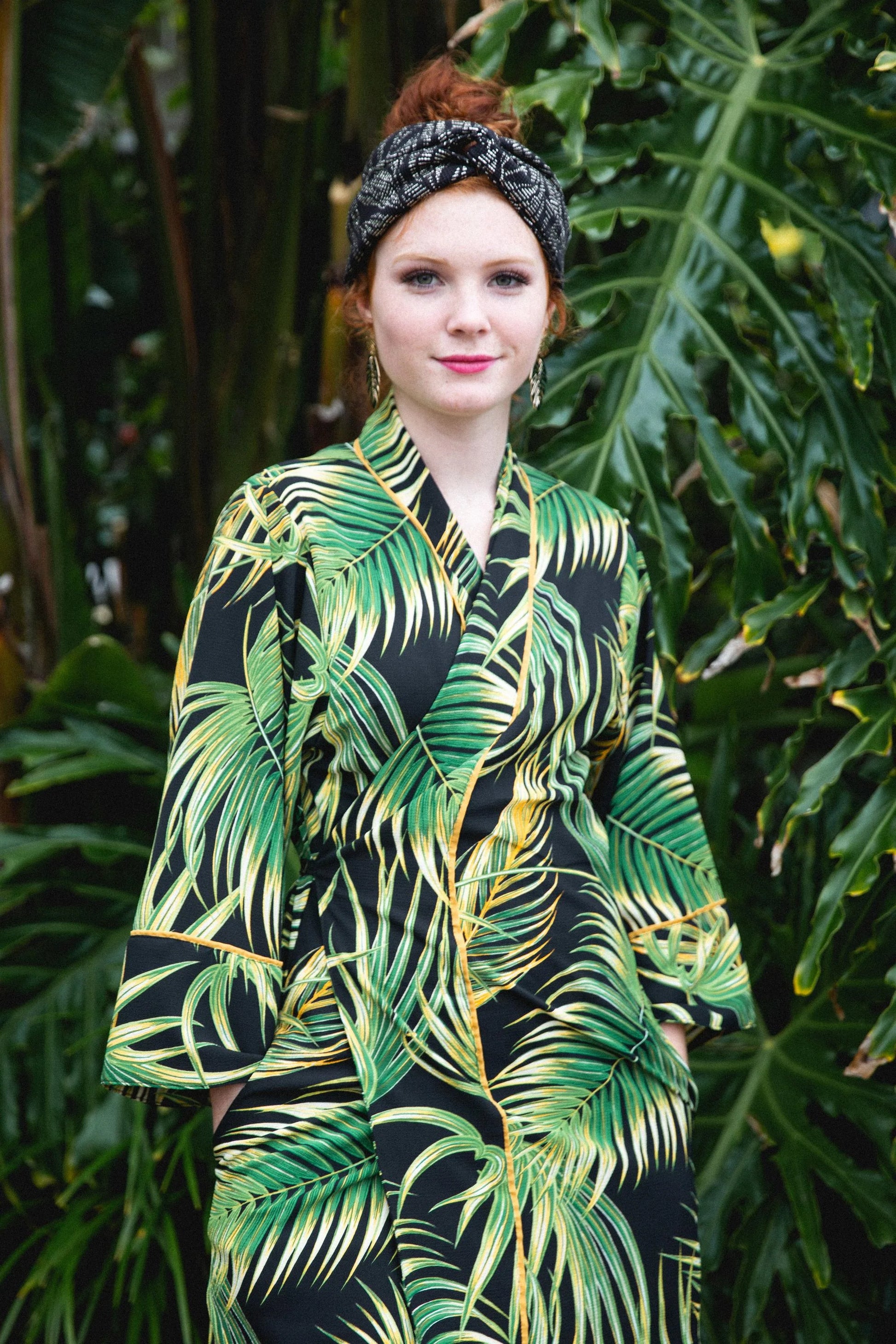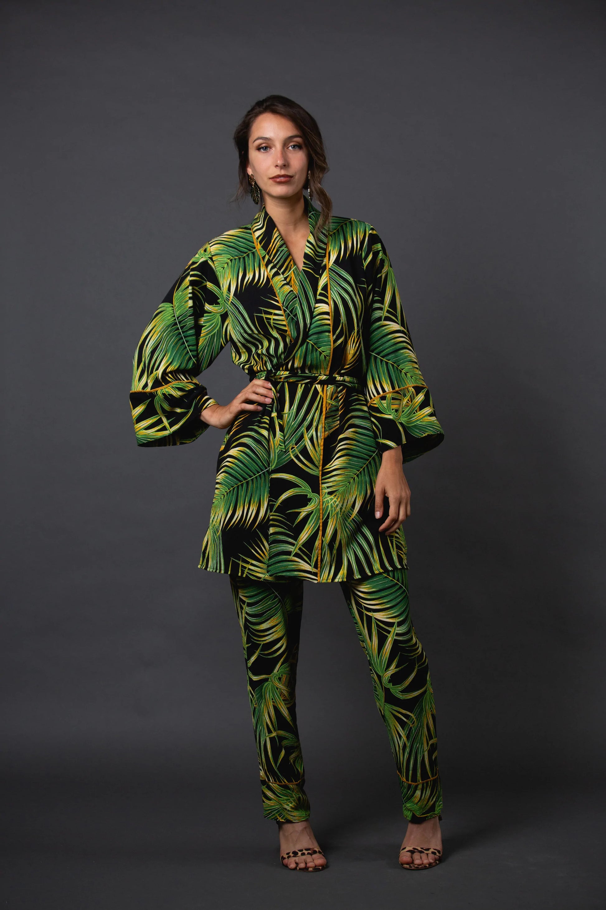These black and emerald palm print paglamas are handmade with a bubble crepe georgette and matching grey piping. The short wrap-style kimono (with pockets!) and side seam buttonholes make the perfect wrap top. The tapered pant features pockets, and a crisp business press.