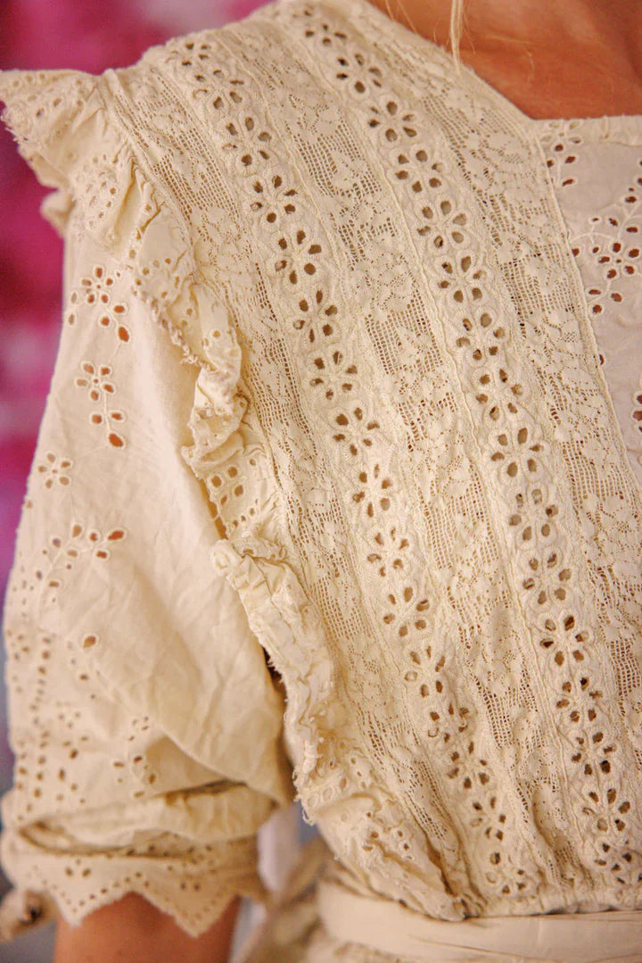 European Cotton Eyelet with Ruffles and Lace Insets | Snaps at Back | Ties at Waist | Hand Mending and Distressing