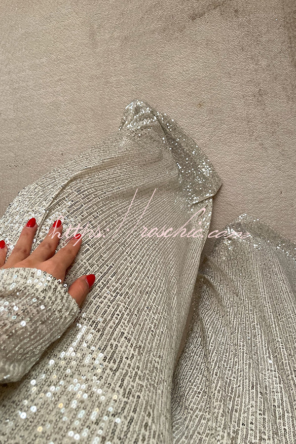 Fashionable Shiny Sequined Long-Sleeved Cropped Top and Casual Wide-Leg Pants Set