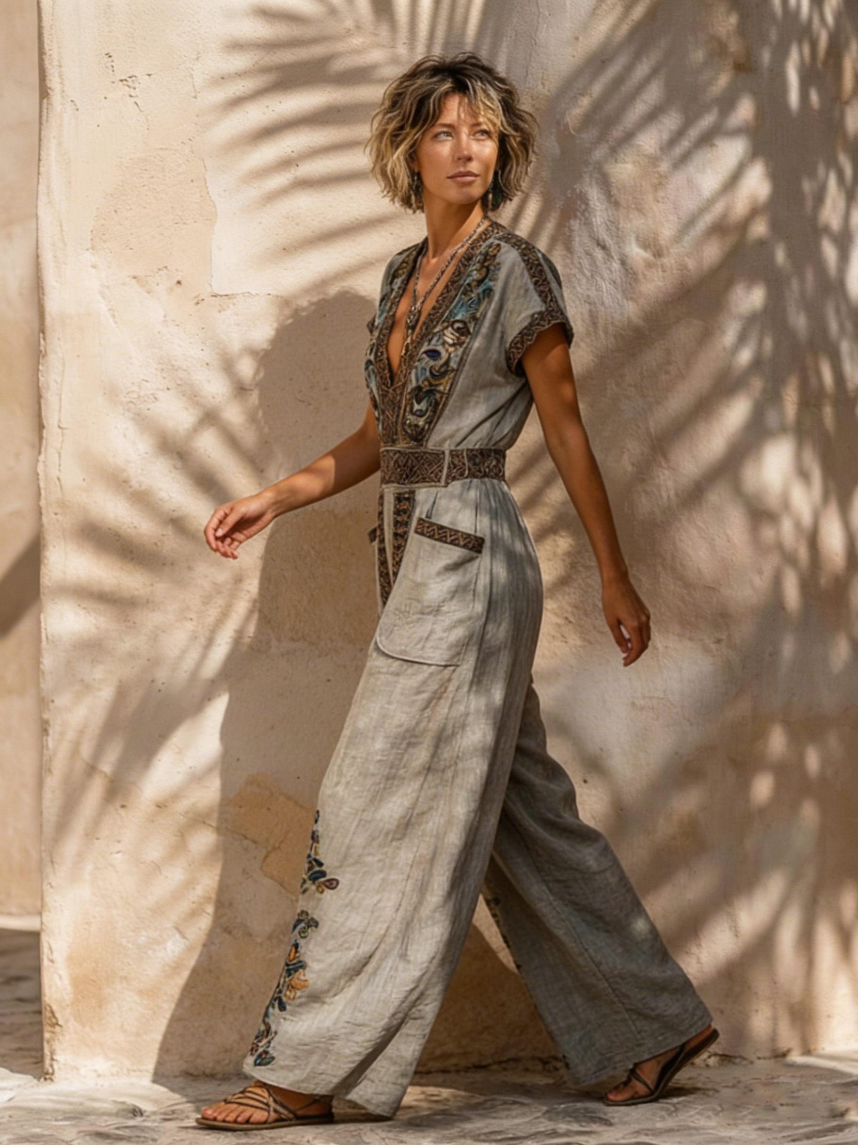 Free-spirited Bohemian Retro Print Loose Cotton-Linen Jumpsuit
