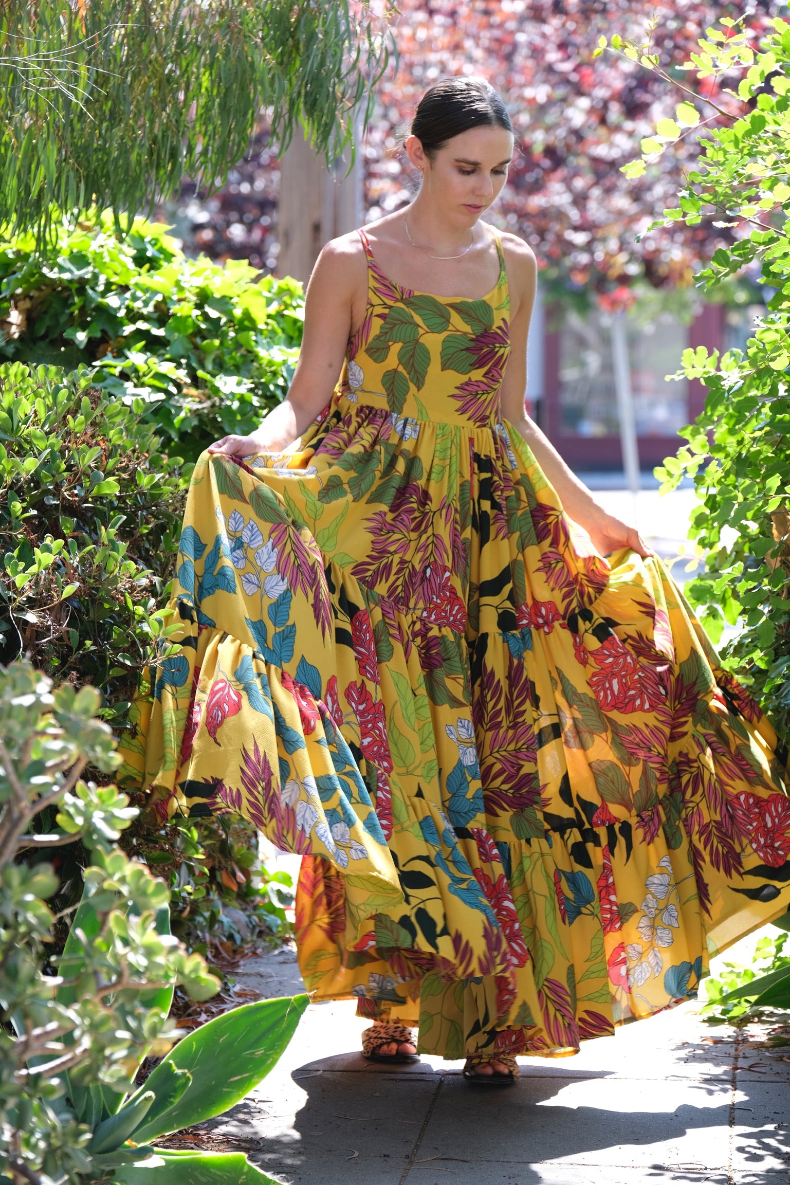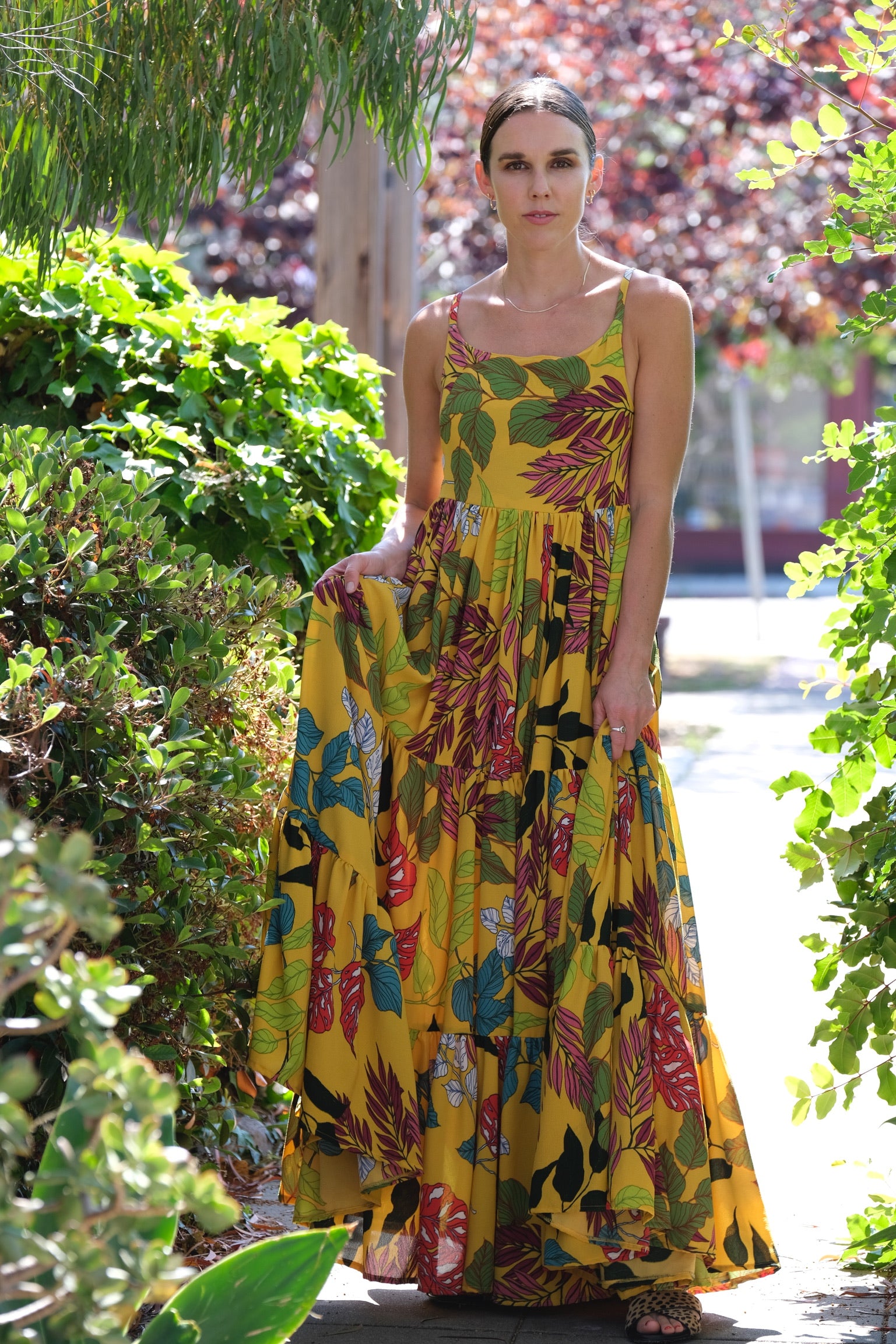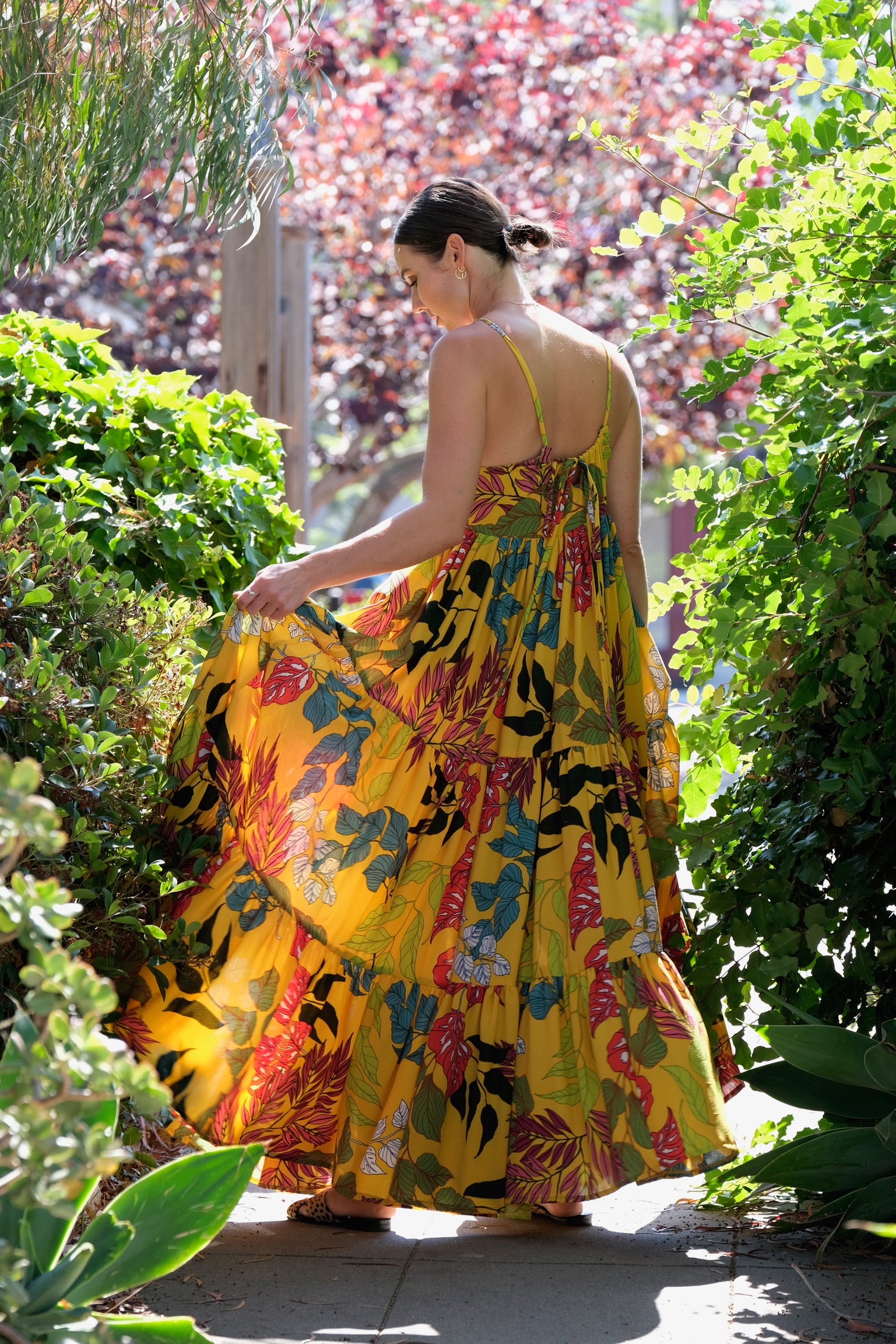 The Villa dress slips on with an adjustable back strap closure. Featuring pockets and three floating tiers of cloud like ruffles, this piece is sure to make a statement dressed up, or pair well with flat sandals for an ultra luxe farmers' market visit.