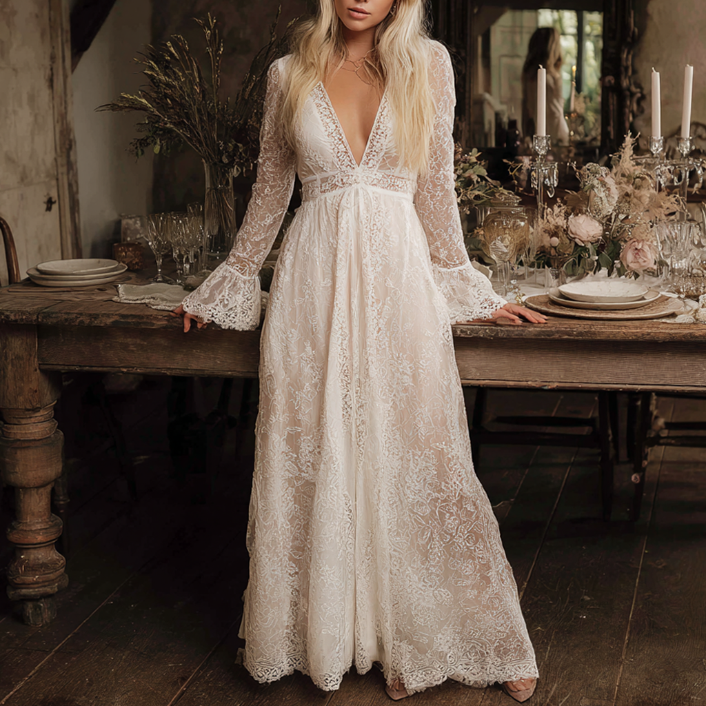 Lace Long Sleeve V-Neck Boho Wedding Dress With Flared Sleeves And Deep Plunge Neckline