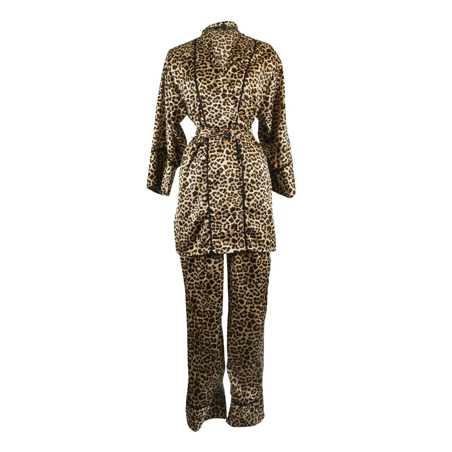 These classic leopard paglamas are handmade with a sleek sateen georgette and matching black piping. The short wrap-style kimono (with pockets!) and side seam buttonholes make the perfect wrap top. The tapered pant features pockets, and a crisp business press.