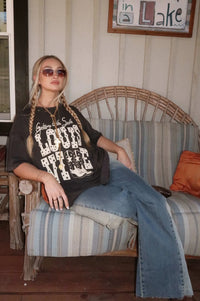 - Vintage-style "Gateway to the South Louisville" text print with cowboy boots graphic.