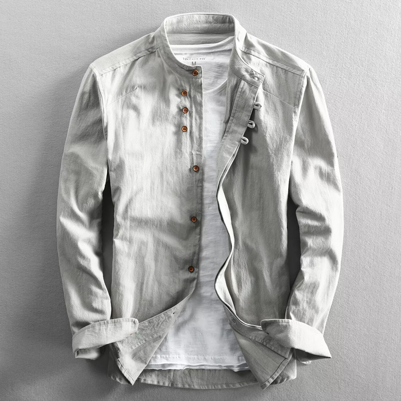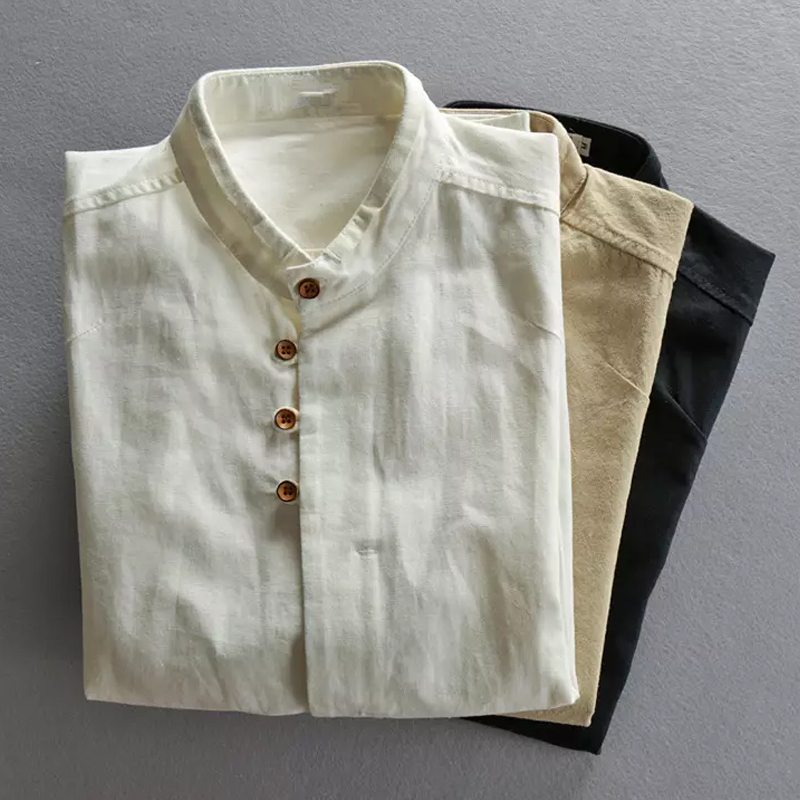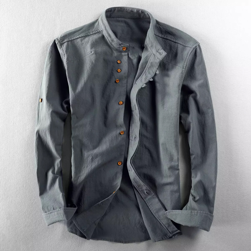 Men's Cotton And Linen Long-Sleeved Stand-Up Collar Shirt