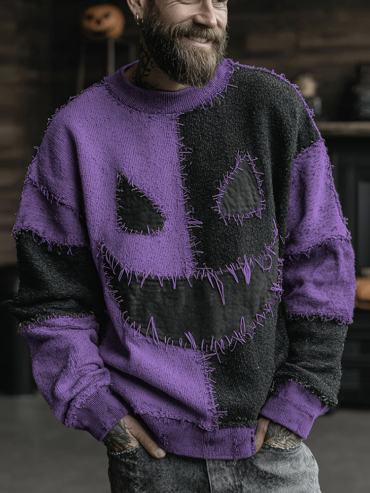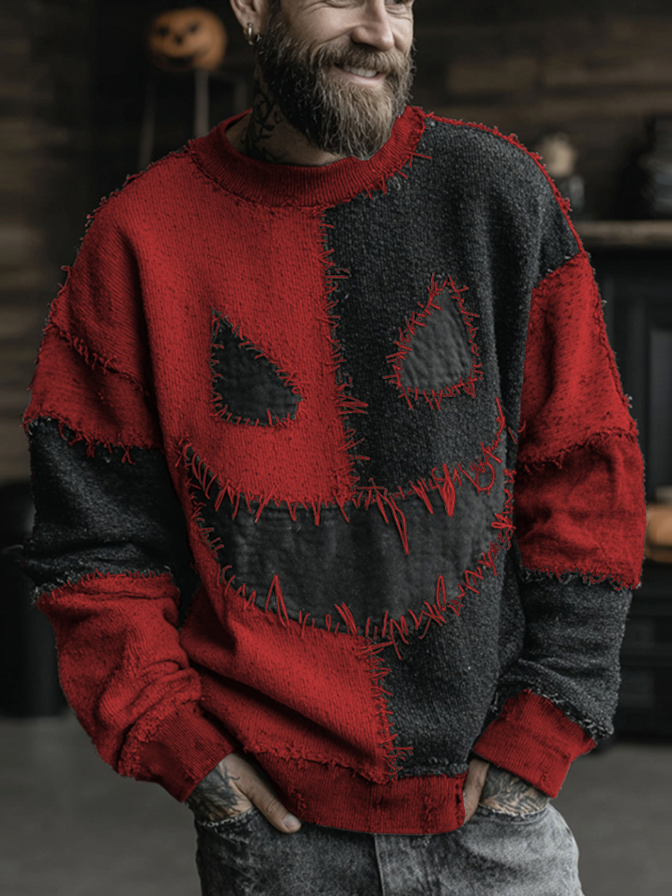 Men's Halloween Spooky Face Colorblock Stitched Cozy Knit Sweater