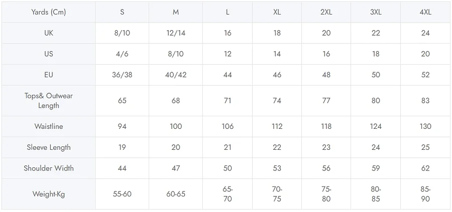 Yards (cm)SMLXL2XL3XL4XL5XL