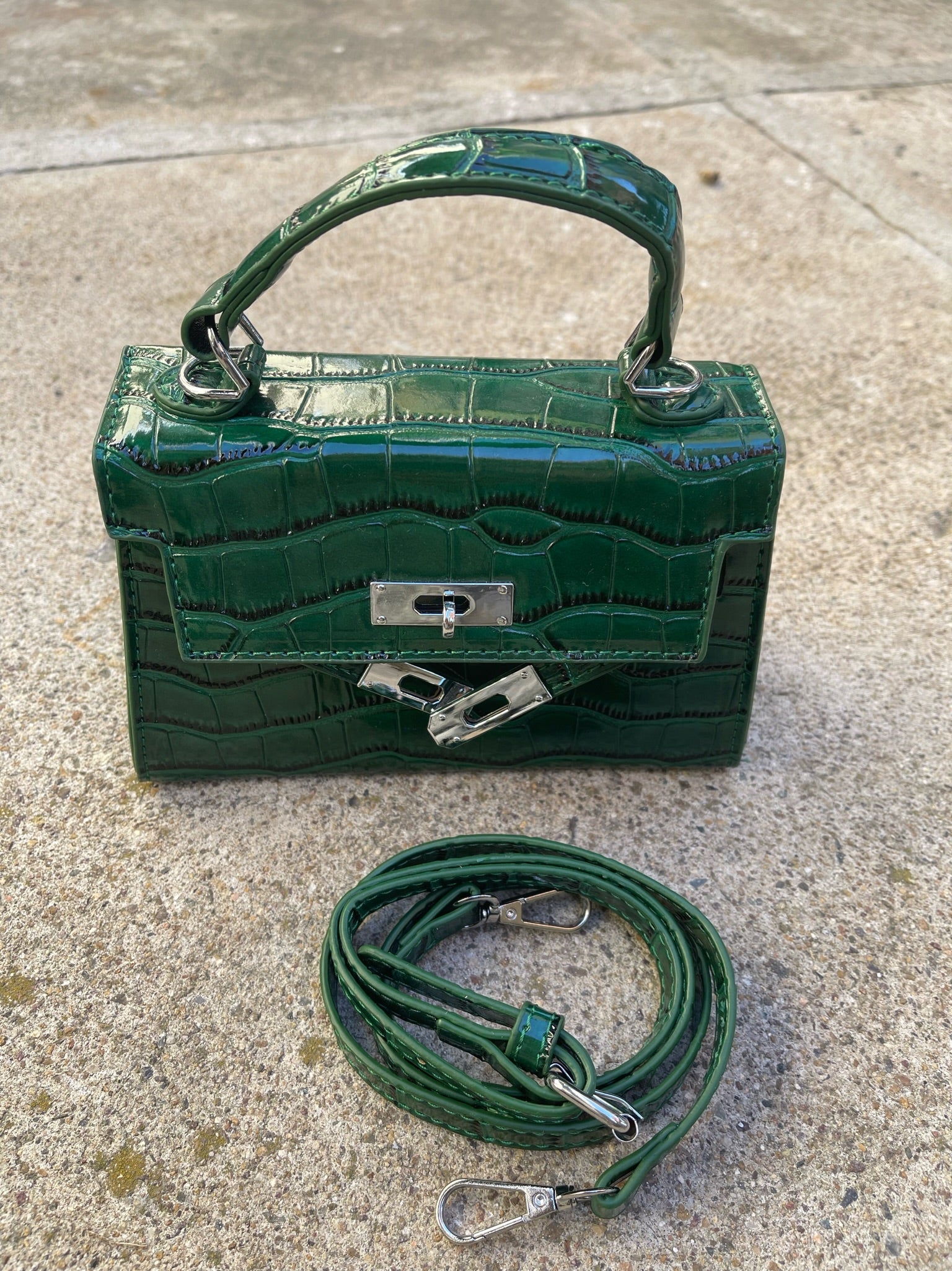 A mini top handle bag in faux crocodile skin. Easily dressed up or down and always chic !