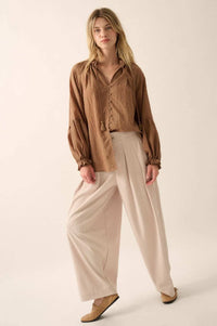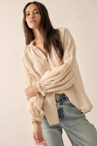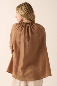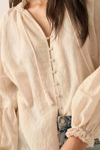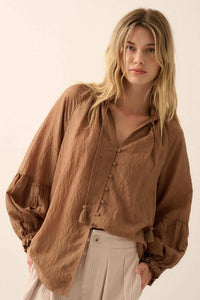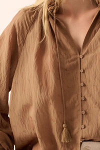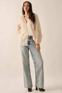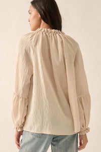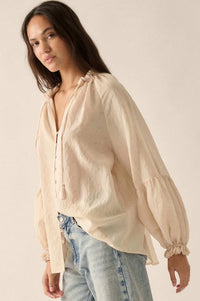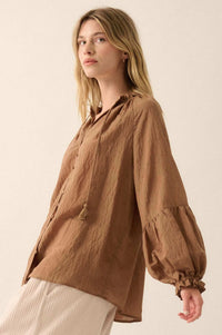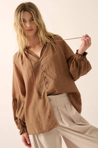 Poetic Soul Buttoned Jacquard Tie-Neck Peasant Top