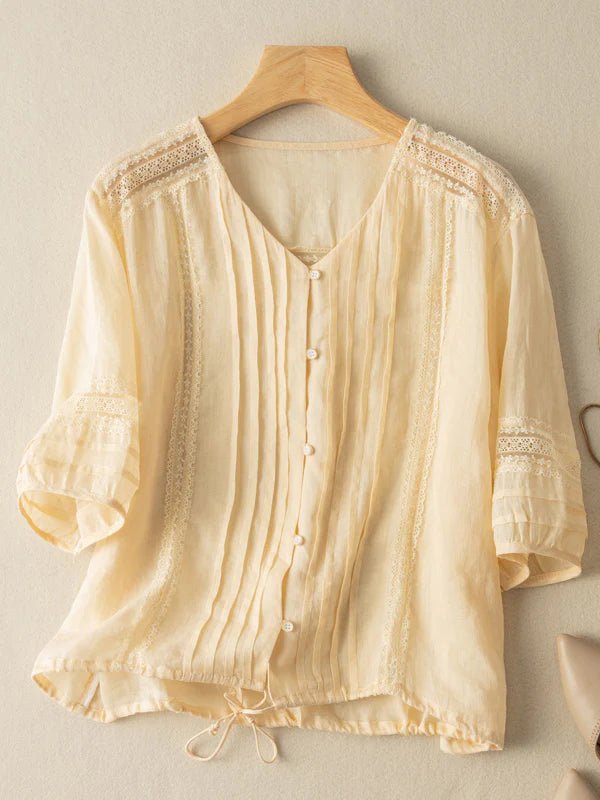 Pure Color V Neck 3/4 Sleeve Casual Linen Top