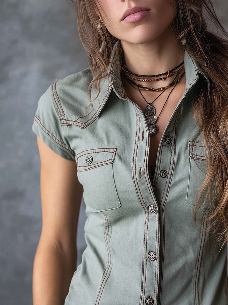 The Retro Button Pockets Denim Blouse is a versatile wardrobe staple that mixes vintage details with everyday practicality. With its relaxed silhouette, functional pockets, and timeless indigo wash, it¡¯s an easy piece to dress up or down¡ªmaking it a go-to for effortless, on-trend styling season after season.