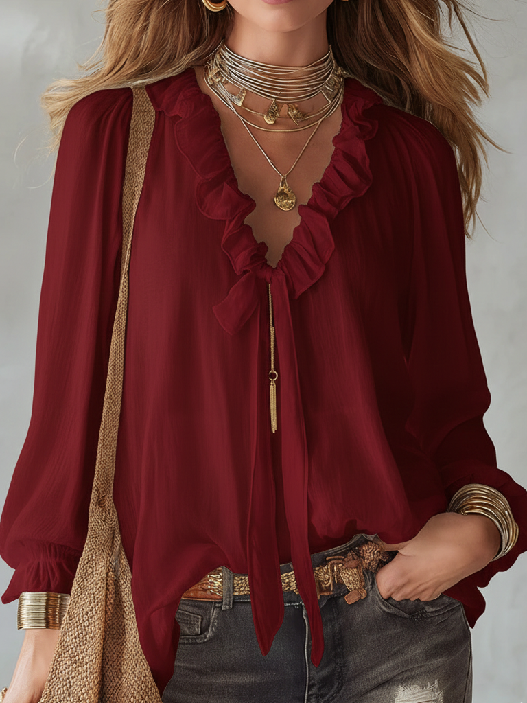 Retro Romantic V-neck Tie Lantern Sleeve Blouse