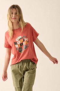 • Vintage-style "Ropin' & Ridin' " text print with cowboy boots, cowboy hat, and flowers graphics.