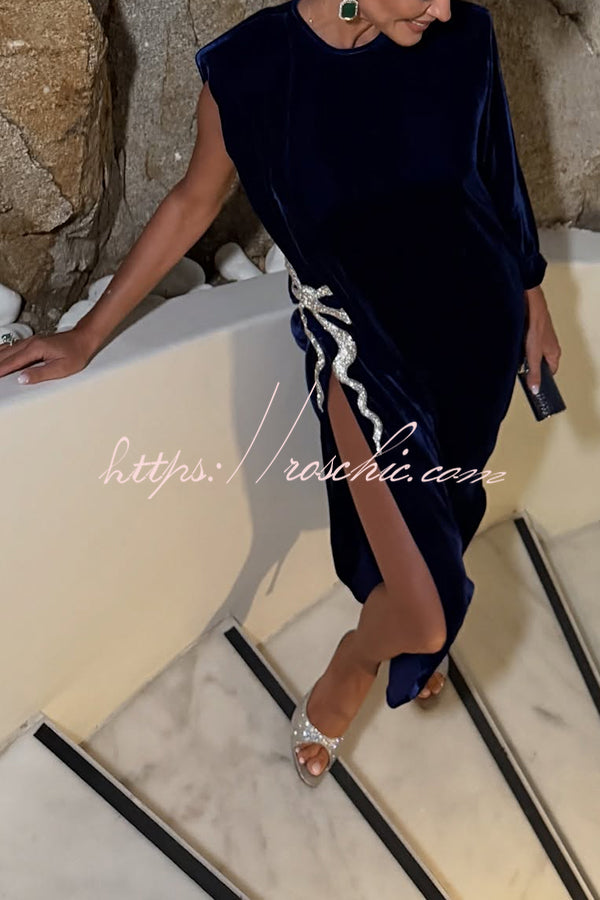 - This luxurious velvet gown features a modern asymmetrical silhouette with bold shoulder pads and a stylish bow at the hip. This one-sleeved gown features a sleek slit, perfectly balancing glamour and modern elegance.Our distinctive clothing will add instant style to your wardrobe .