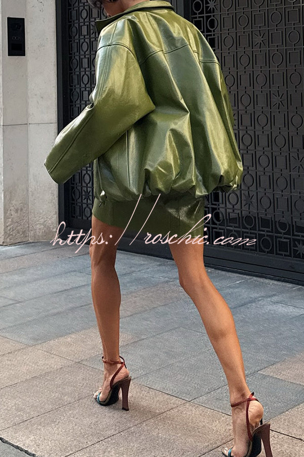 Solid Color Loose Long Sleeve Pocket Casual Leather Jacket