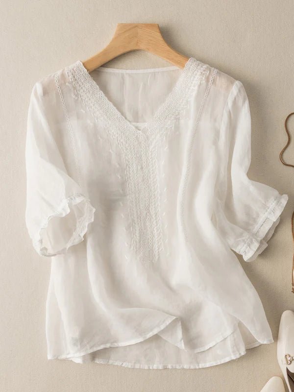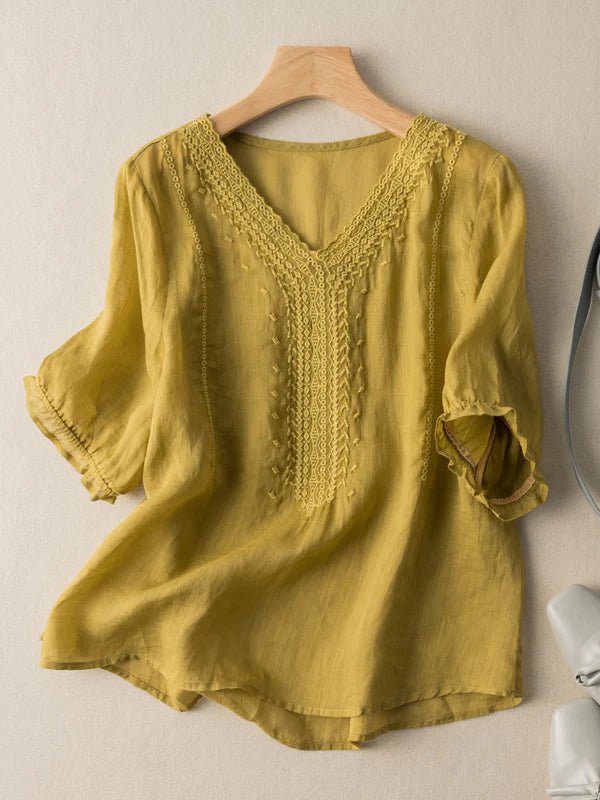 Solid Color V Neck Short Sleeve Casual Linen Top